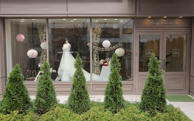 ショーウィンドウには、新作ドレスや小物を展示しています。