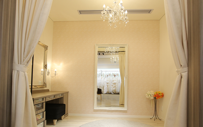 人気ブランドからナチュラル・スウィート・エレガンスとテイスト毎に衣裳を取り揃えたフロア。 試着スペースはすべて個室なので、周りを気にせずゆっくりと試着ができ、お子様連れでも安心です。