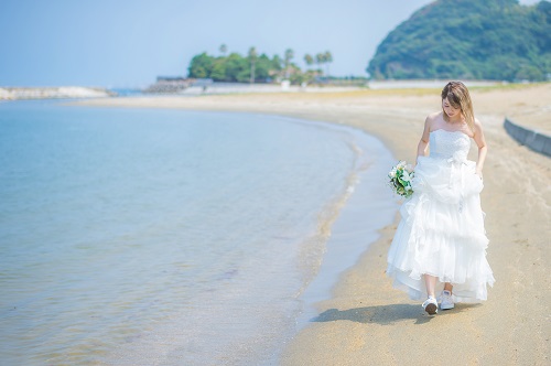 スカイブルーの海にウエディングドレスが映えます☆