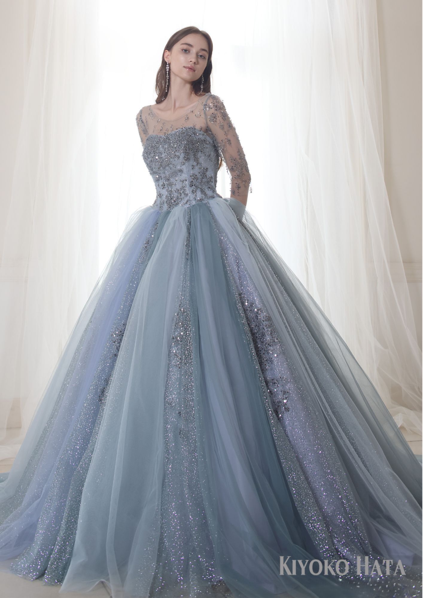 刺繍が施されたロングスリープと2色のチュールが繊細さを表現するキヨコハタブルーグレー