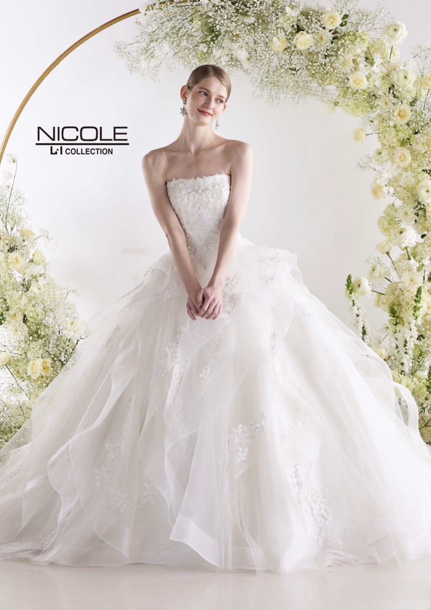 繊細なシルバー糸が輝きを放つ、軽やかで動きのあるラッフルデザインのプリンセスラインドレス