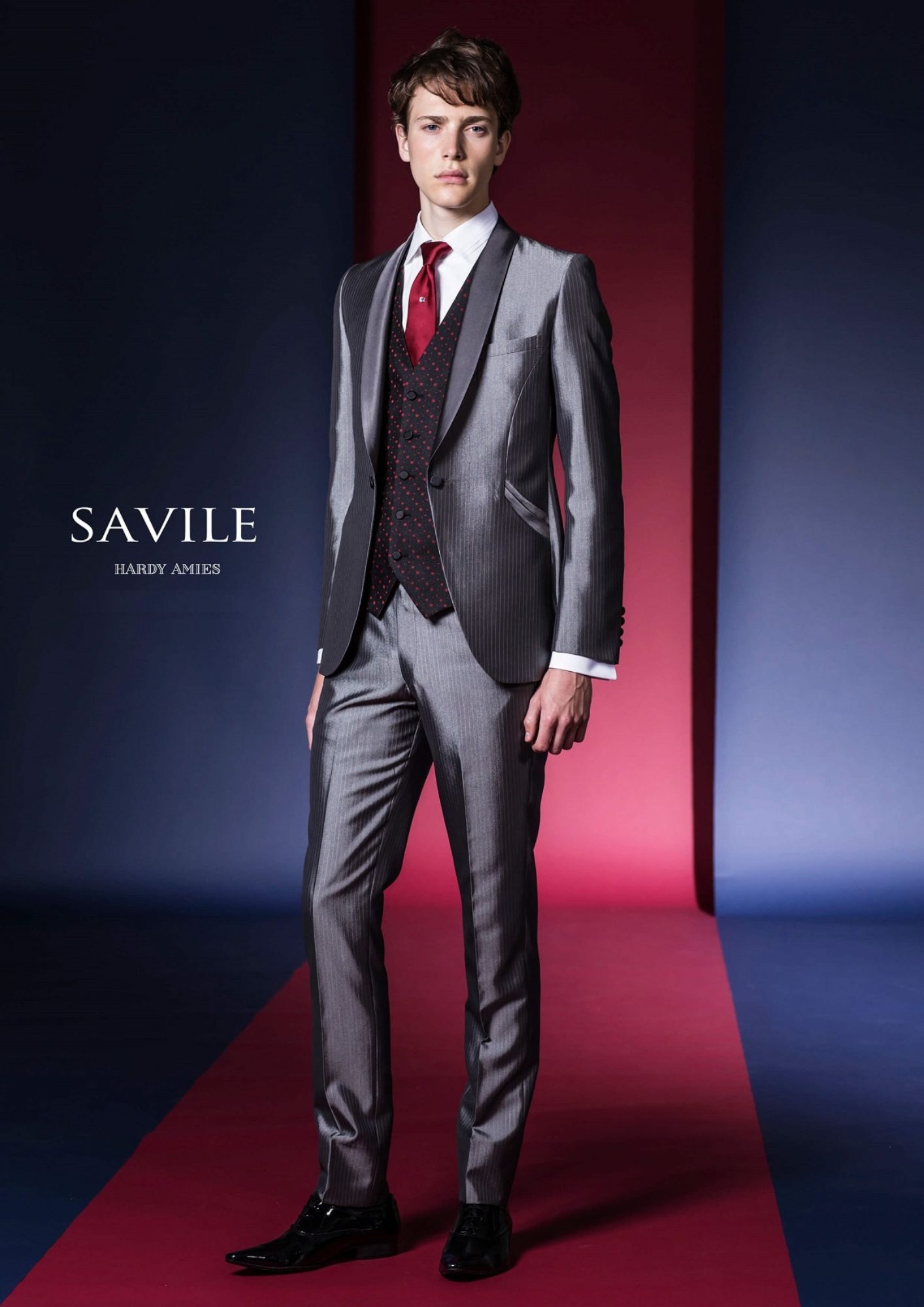 立体的なシルエットと勤続的なスチールグレーで繊細なストライプ柄の光沢素材が特徴