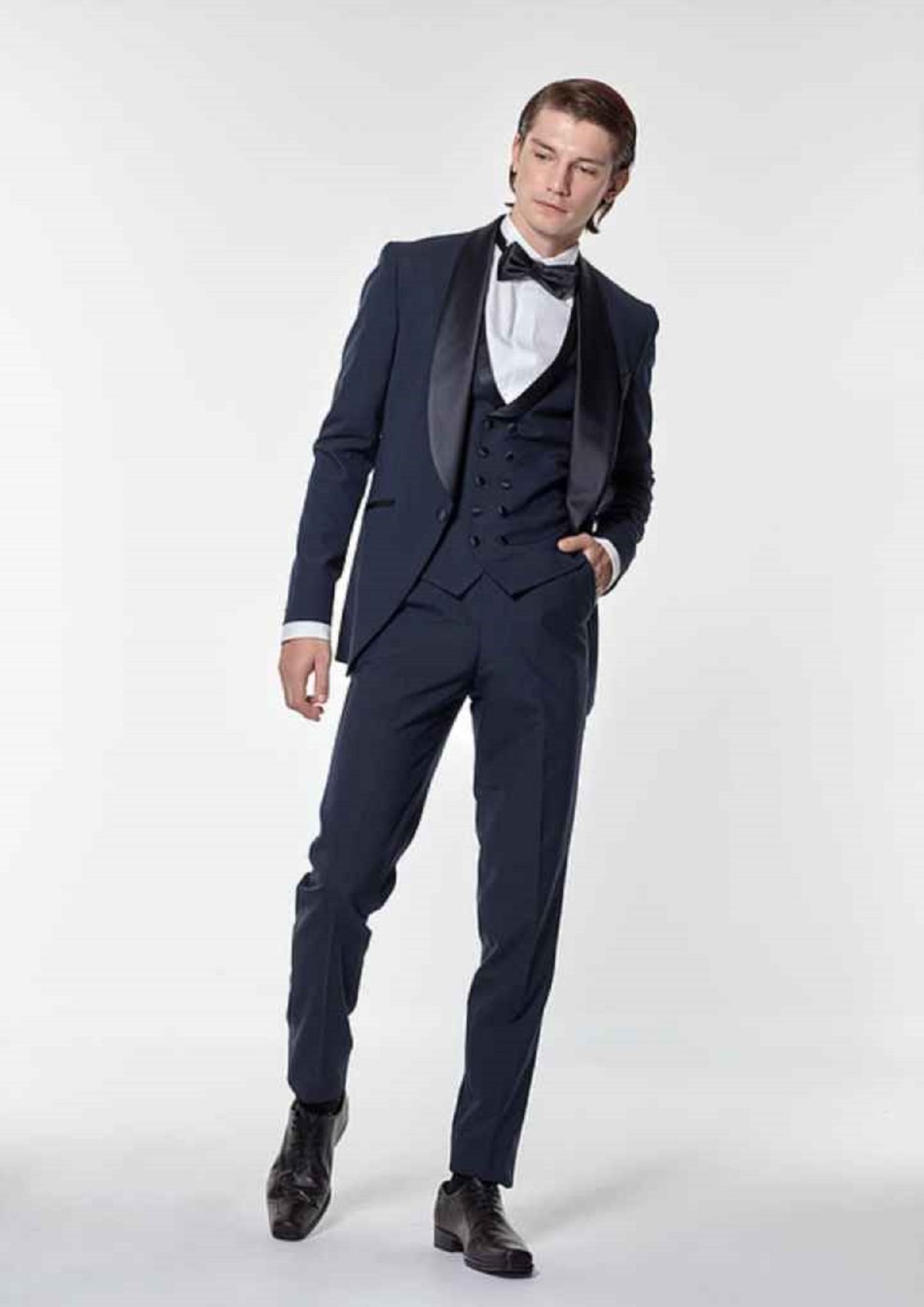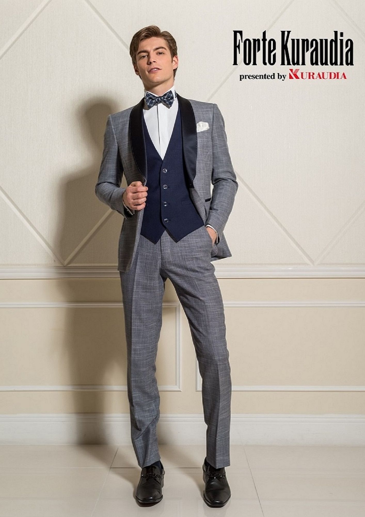 ネイビーのショールカラーとチェックのベストがカジュアルさを演出