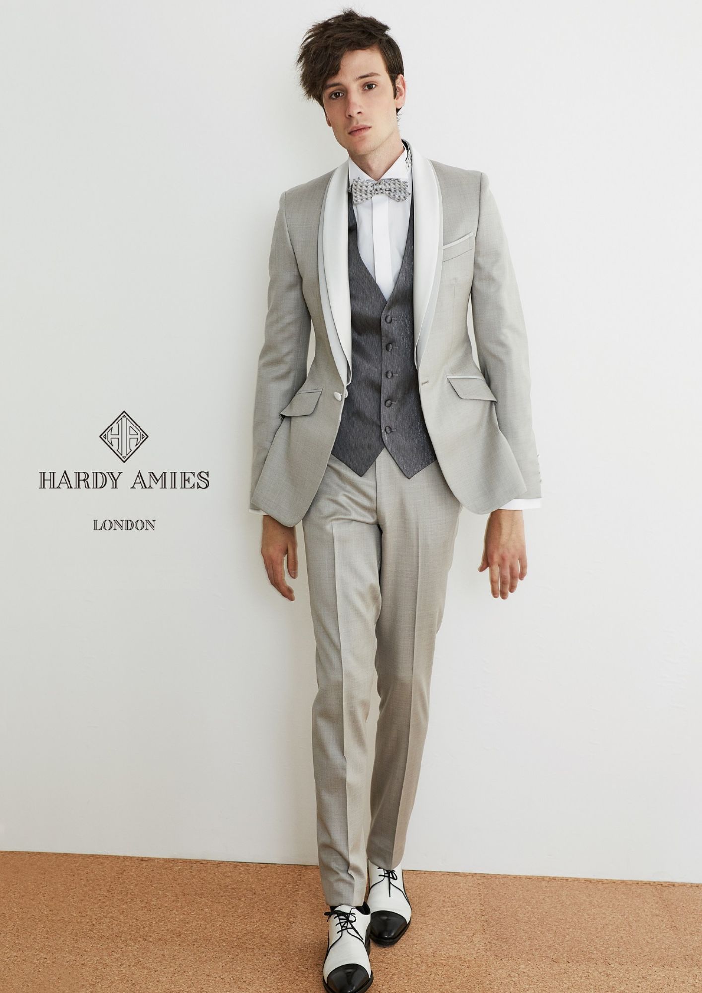 素材にトラディショナルな白黒のバーズアイを使用したショールカラー