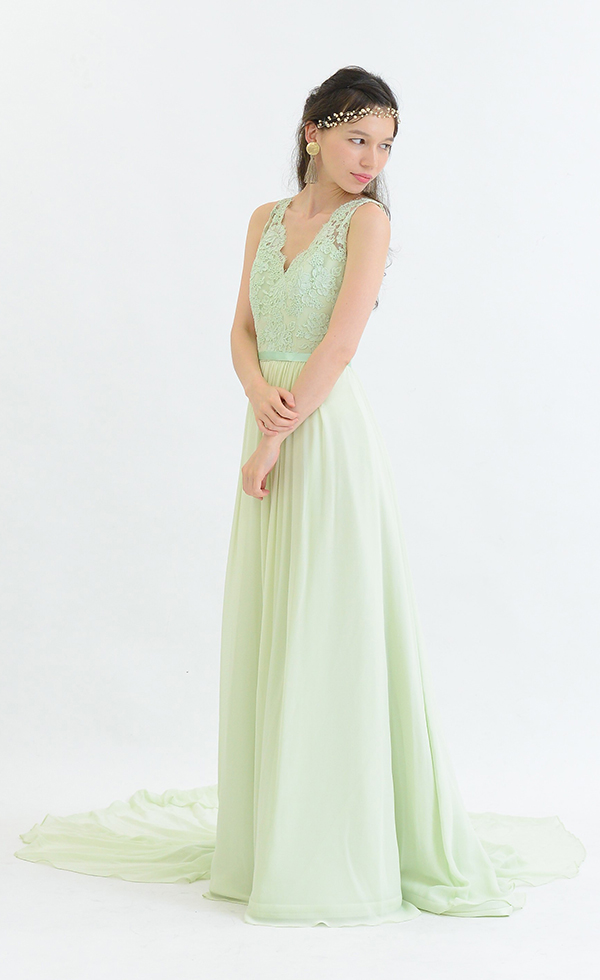 軽やかなスカートと上品な胸元のレースが印象的な一着。スイートになりすぎないミントグリーンは大人な花嫁様にもピッタリです。