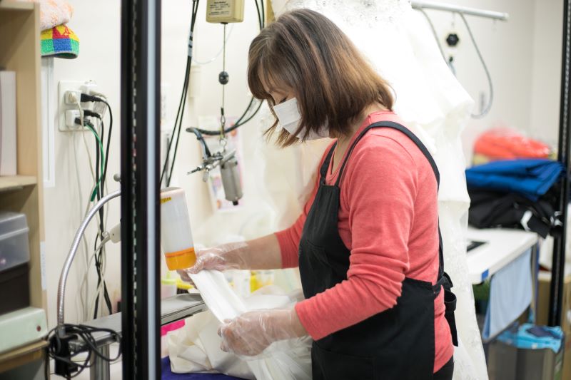 ドレスショップには衣裳を提案する『ドレスコーディネーター』だけでなく、衣裳のメンテナンスや、お式に向けて衣裳の準備を行う『アトリエスタッフ』が存在します。