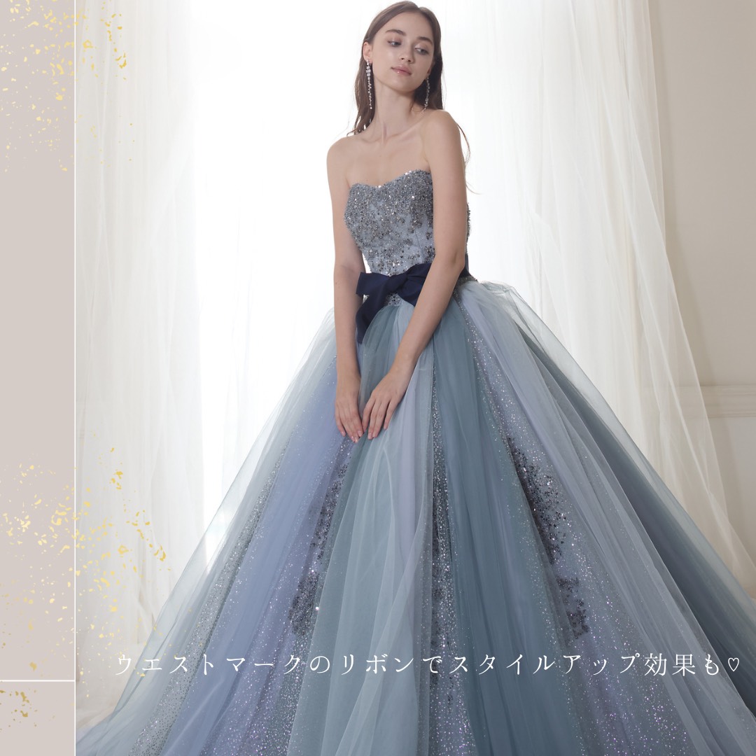 透明感のあるブルーグレーのカラーが美しいグリッタードレス。