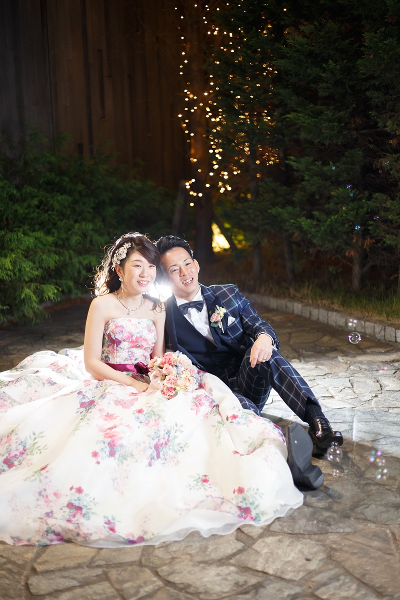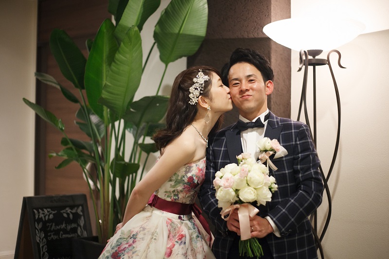 ネイビーのチェックタキシードとプリント柄のカクテルドレスの相性も抜群でした♬