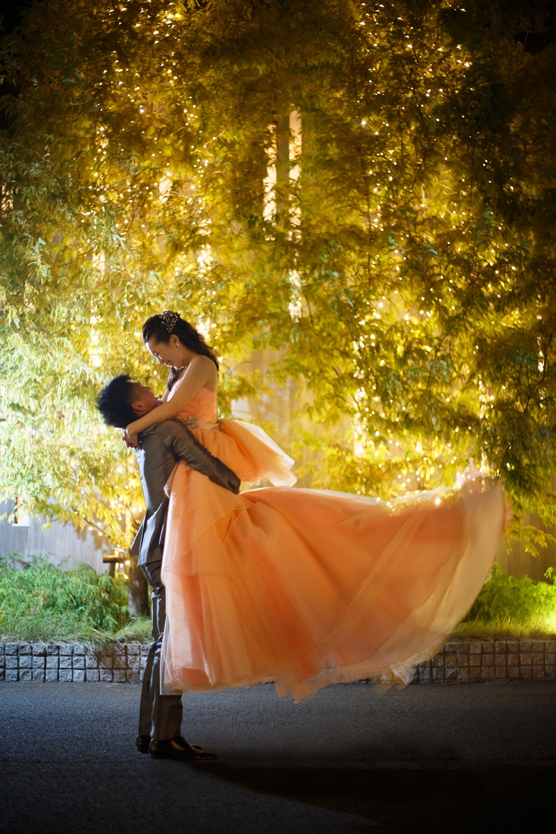 色ドレスは、柔らかなサーモンオレンジのチュールドレス。