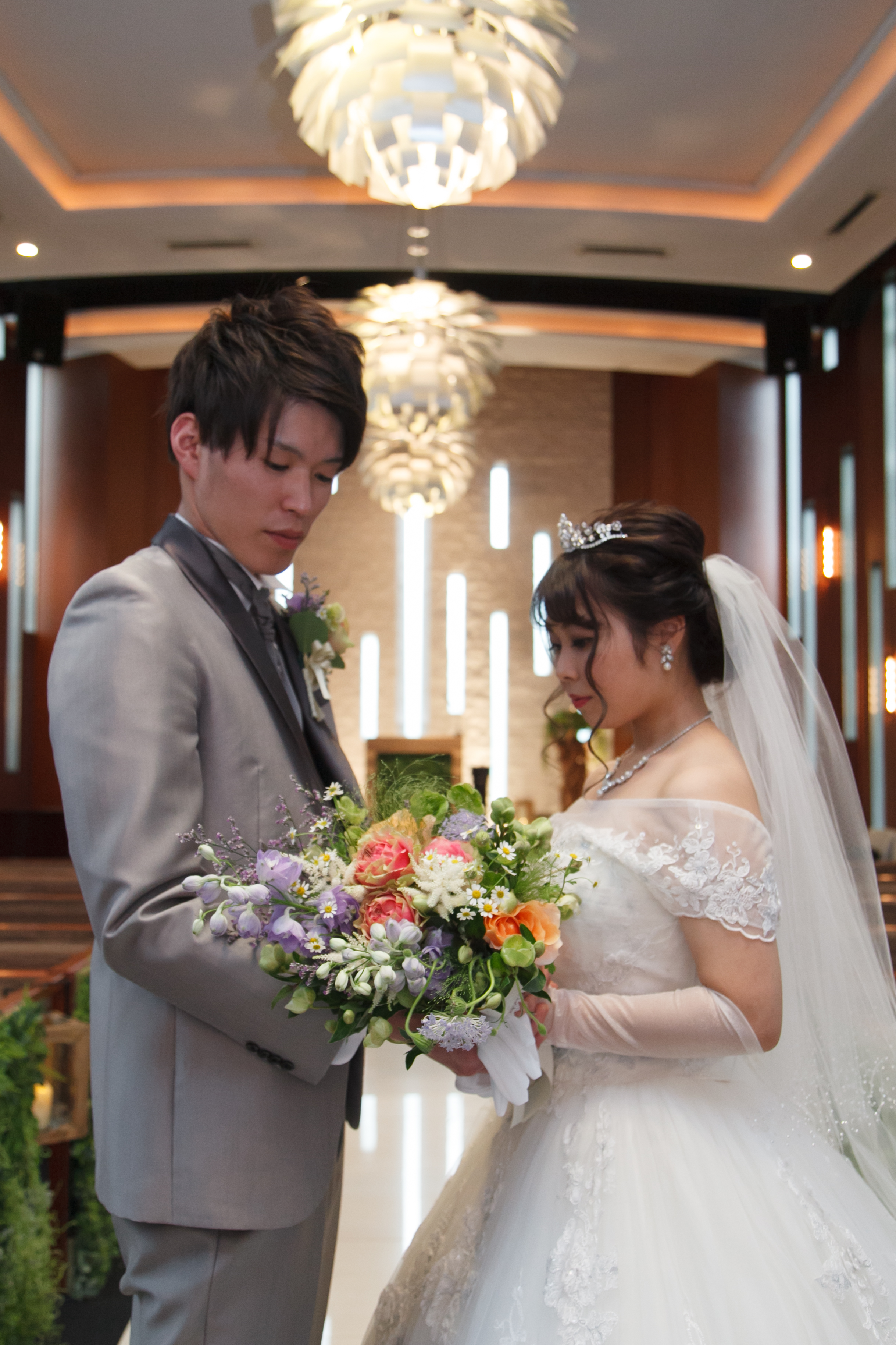 真っ白なウエディングドレスは今流行りのオフショルダー付ドレス♡