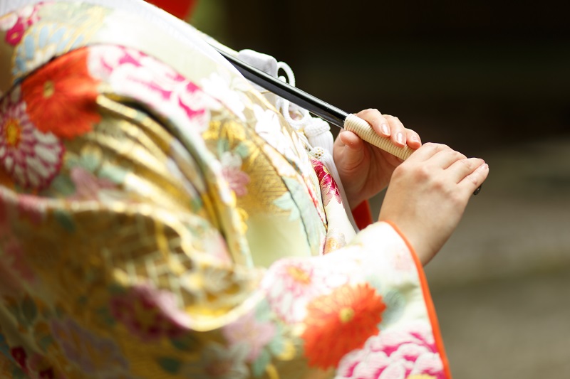 女性らしい花々の柄の色打掛。